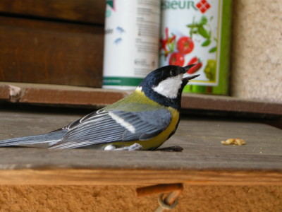 buiten op het overdekte terras toen deze mees tegen het ruitje aanvloog